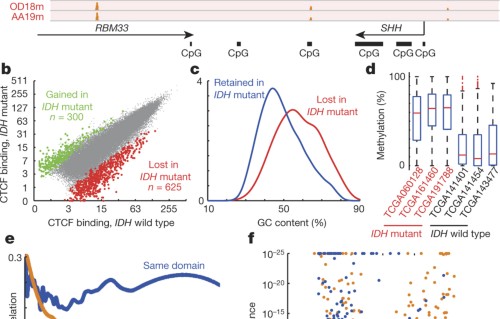 Cancer genome sequencing studies take identified recurrent IDH mutations in brain tumours and other cancers. IDH mutant gliomas take altered Deoxyribonucleic acid methylation landscapes, such every bit hypermethylation of CpG island promoters. Here, Brad Bernstein and colleagues show that the furnishings of IDH1 mutation in gliomas are not limited to CpG islands, and the binding sites of the methylation-sensitive insulator CTCF are also hypermethylated. Disruption of a CTCF boundary near the glioma oncogene PDGFRA allows a constitutive enhancer to aberrantly contact and activate it. IDH mutations can therefore promote gliomagenesis by disrupting chromosomal topology and allowing aberrant gene regulatory interactions.