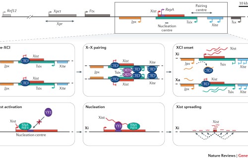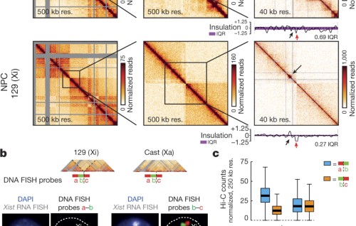 During female development, X-chromosome inactivation is triggered by upregulation of the non-coding Xist RNA from 1 of the ii X chromosomes. Chromosome conformation capture approaches have shown a loss of local construction on the inactive X (Xi) and germination of large mega-domains, separated by a region containing the DXZ4 macrosatellite. These authors investigate the construction, chromatin accessibility and expression status of the mouse 11 using allele-specific Hi-C, ATAC–seq and RNA–seq in embryonic stem cells and neural progenitor cells (NPCs). The 11 in NPCs lacks topologically associating domains (TADs) except around genes that escape X-chromosome inactivation, suggesting that TAD germination is driven by gene activity. The DXZ4-containing region and Xist shape the mega-domain construction of the 11.
