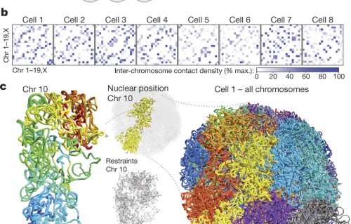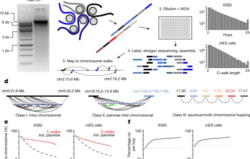 Chromosomes must be folded efficiently in the nucleus to allow firmness and to regulate admission to DNA. Analytical methods used to examine chromosomal structures accept included chromosome conformation capture techniques, which detect pairwise spatial proximity between genomic loci. Hither, Amos Tanay and colleagues develop a chromosome conformation capture sequencing method that uses chromosomal walks (C-walks) to link multiple genomic loci together into three-dimensional proximity chains. Applying the technique to mammalian cells, the authors show that chromosomal territories and topological domains (TADs) are part of a nested hierarchical fold structure and they narrate the chromosomal conformation effectually active and inactive genes. These findings add together to our agreement of how higher order chromosomal structures participate in genome regulation.