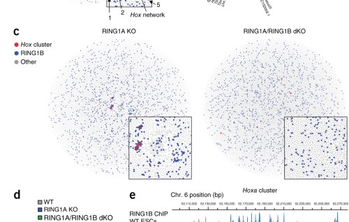Sarah Elderkin and colleagues show that PRC1 acts equally a primary regulator of genome architecture in mouse embryonic stalk cells past organizing genes in 3-dimensional interaction networks. They discover that the strongest spatial network is equanimous of the four Hox clusters and primal early developmental transcription gene genes, and they propose that selective release of genes from this spatial network underlies jail cell fate specification during embryonic development.
